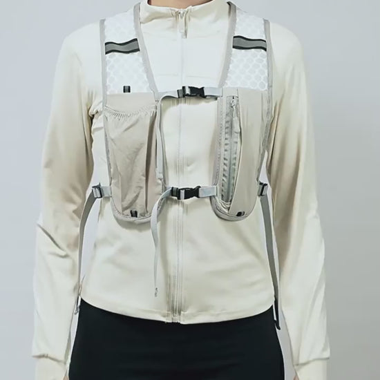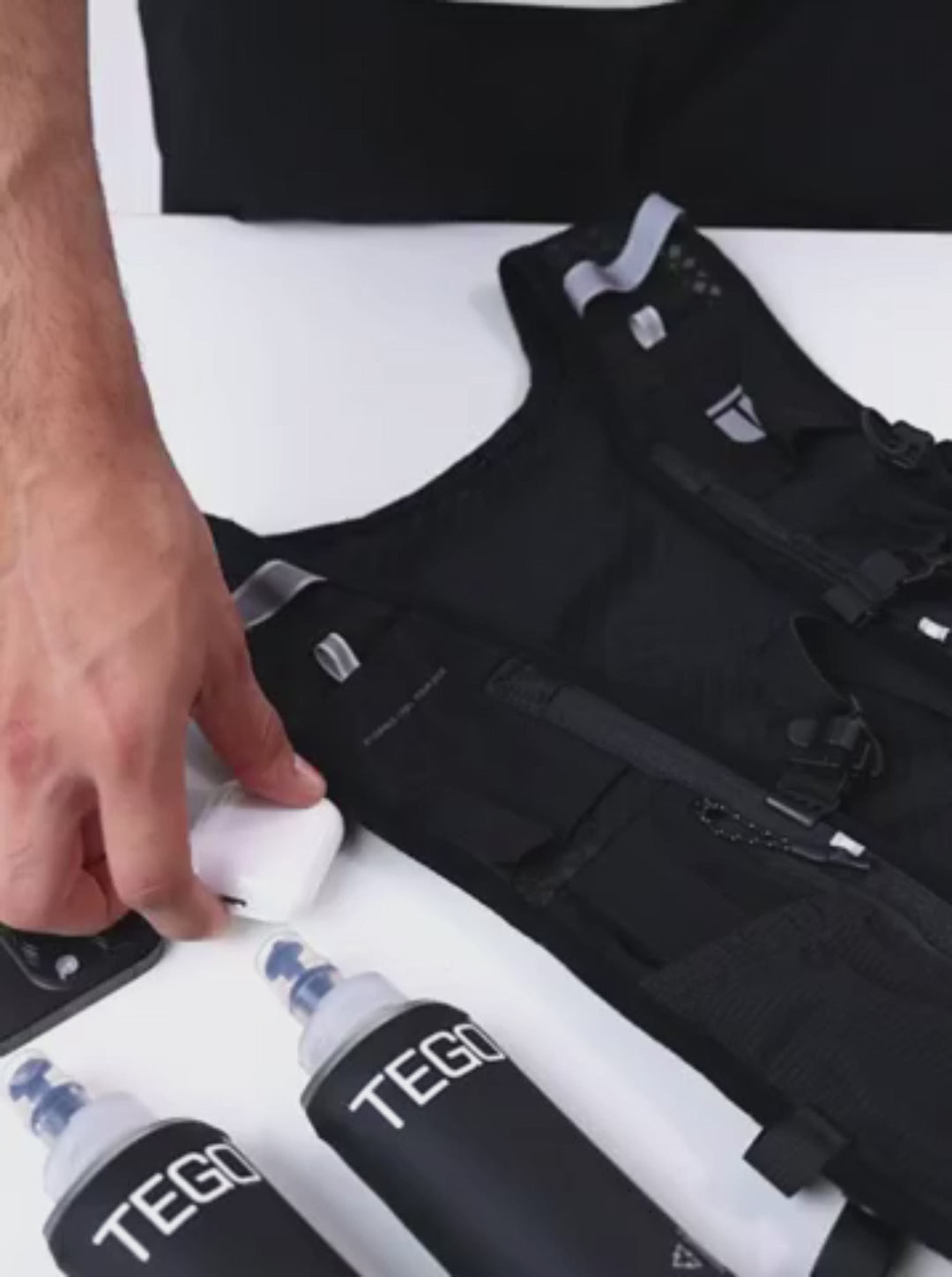 El chaleco cuenta con tres bolsillos frontales ideales para botellas de agua o geles de carrera, manteniéndote hidratado y con energía sin interrumpir tu ritmo.